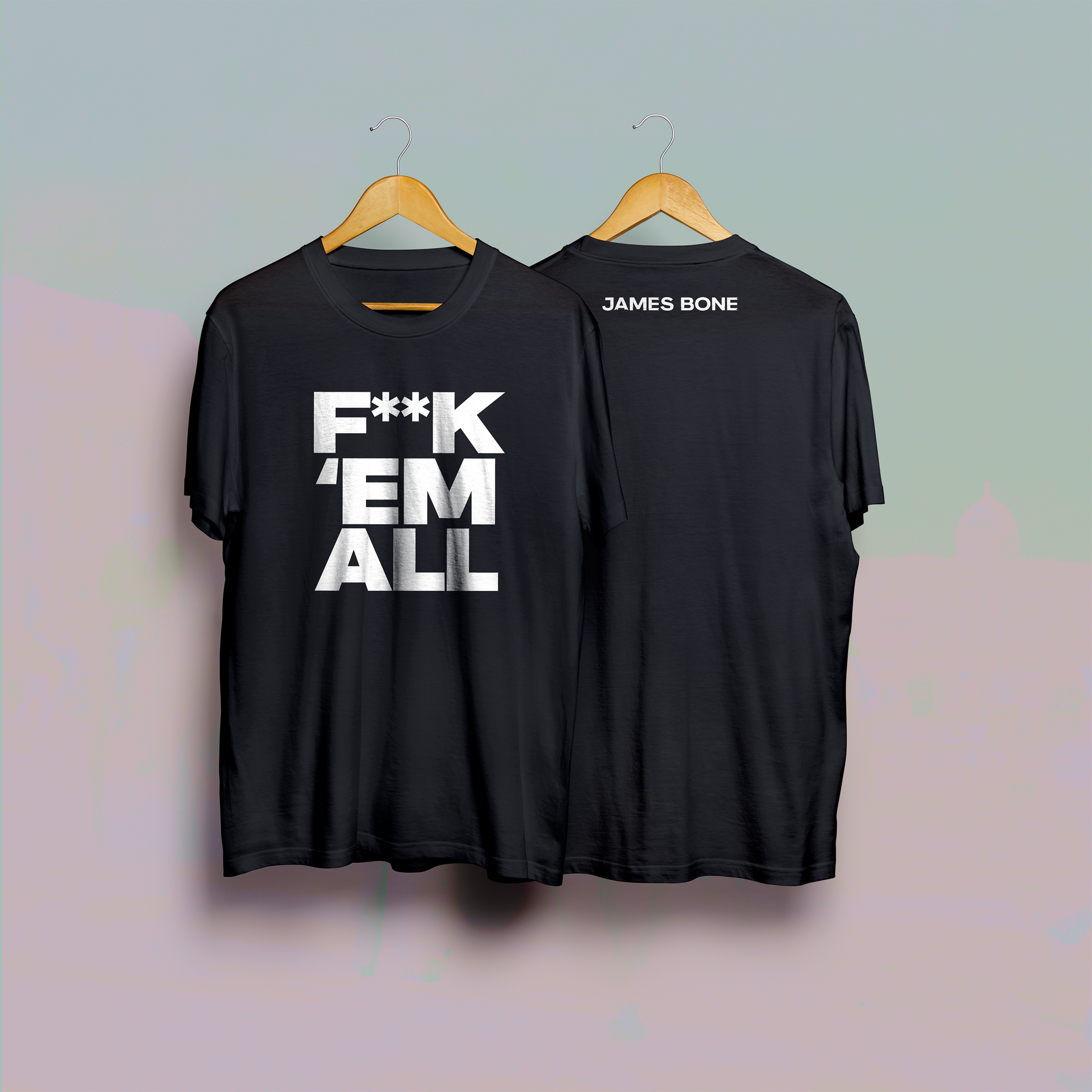"F**K 'EM ALL" logo on a Black T-Shirt with James Bone Logo on the back. Unisex.